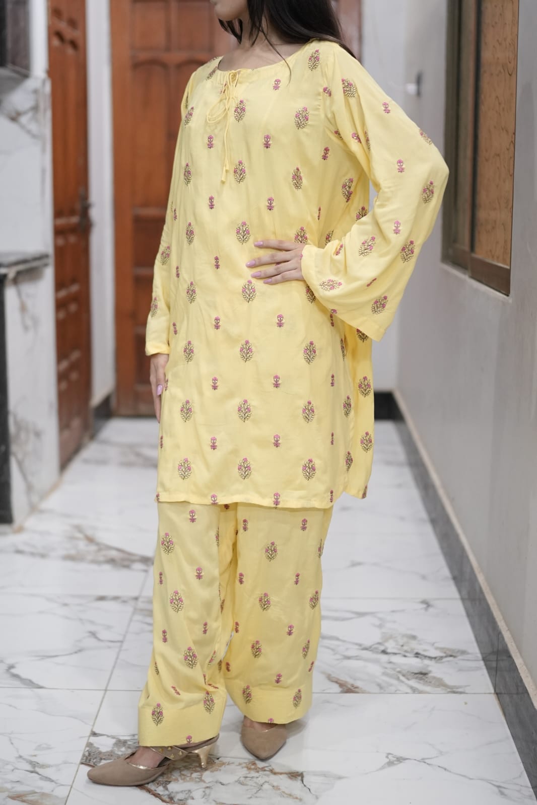 Gul-e-Sherren is a beautifully printed linen outfit in a soft pastel yellow shade, featuring delicate floral motifs and a relaxed, elegant fit. Perfect for everyday comfort and graceful summer wear.