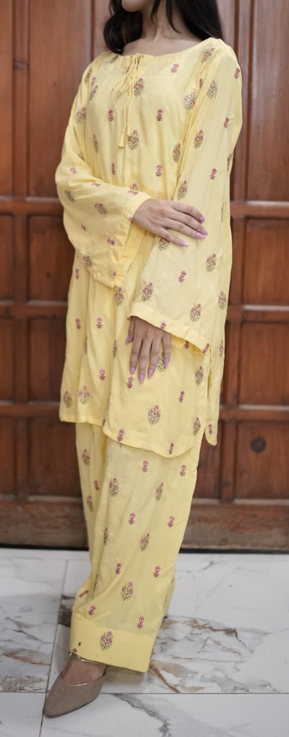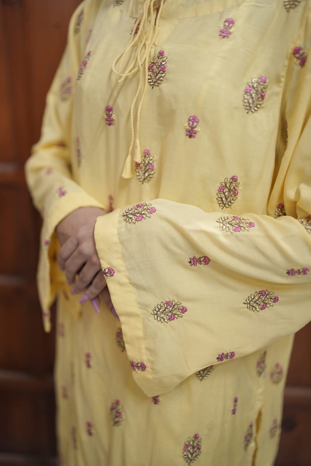 Rendered in a soothing pastel yellow hue, Gul-e-Sherren captures the essence of summer and positivity. The outfit is adorned with delicate floral motifs that add a subtle yet graceful touch. These finely balanced prints enhance the overall look without overwhelming the simplicity of the design. The combination of soft colour and refined detailing creates a timeless aesthetic that feels both elegant and contemporary, making it suitable for various occasions and personal styles.