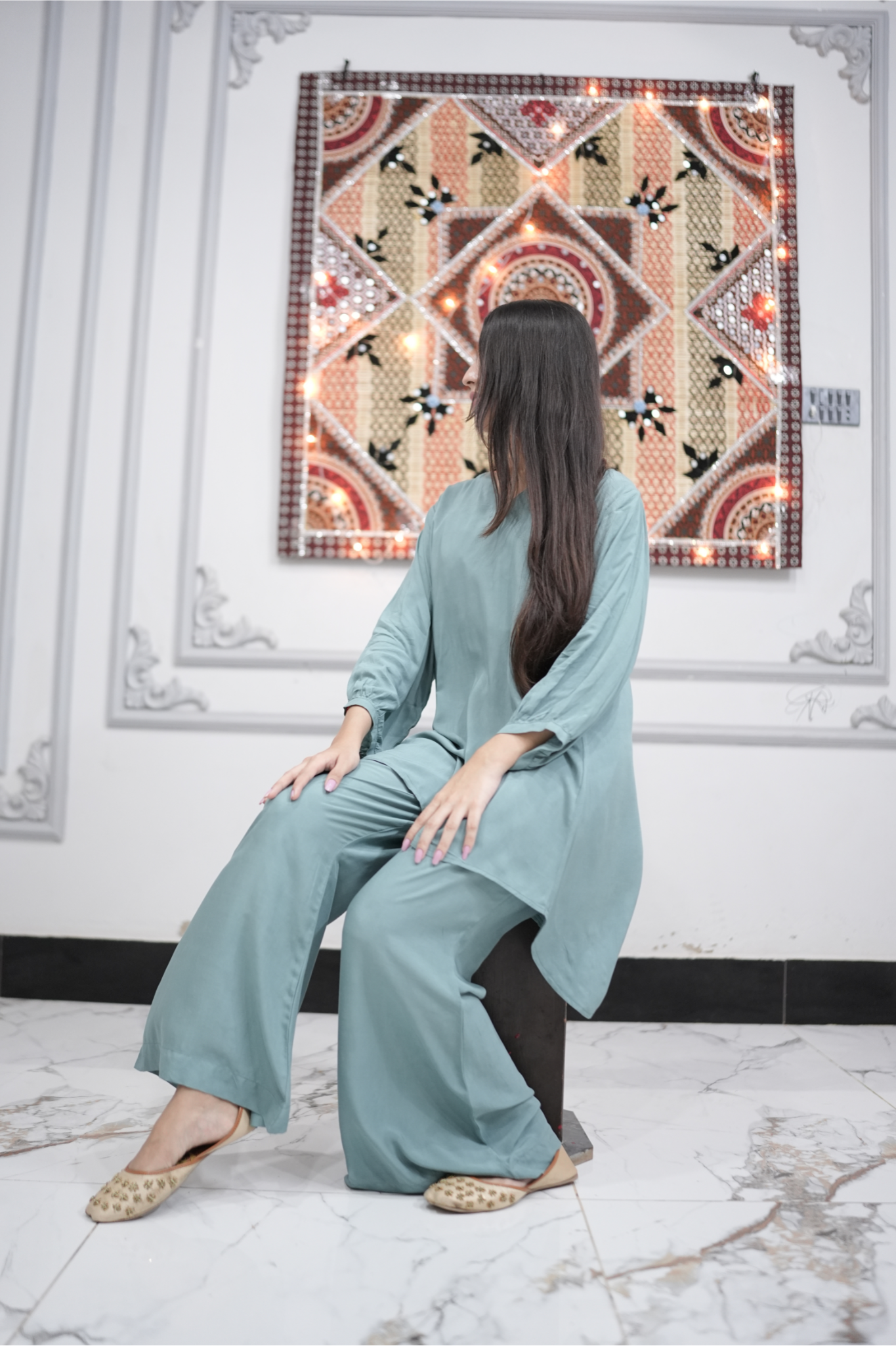 Draped in a refreshing green co-ord set, this flowy silhouette seamlessly combines comfort and elegance. Perfect for modern women who adore effortless style with a touch of elegance.